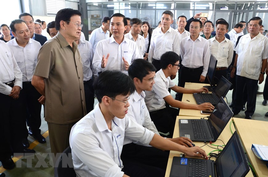 Thủ tướng Lào Thongloun Sisoulith tham quan một công ty về lĩnh vực Công nghệ-Thông tin trong Khu công nghệ cao Đà Nẵng (3/10/2019). (Ảnh: Quốc Dũng/TTXVN)
