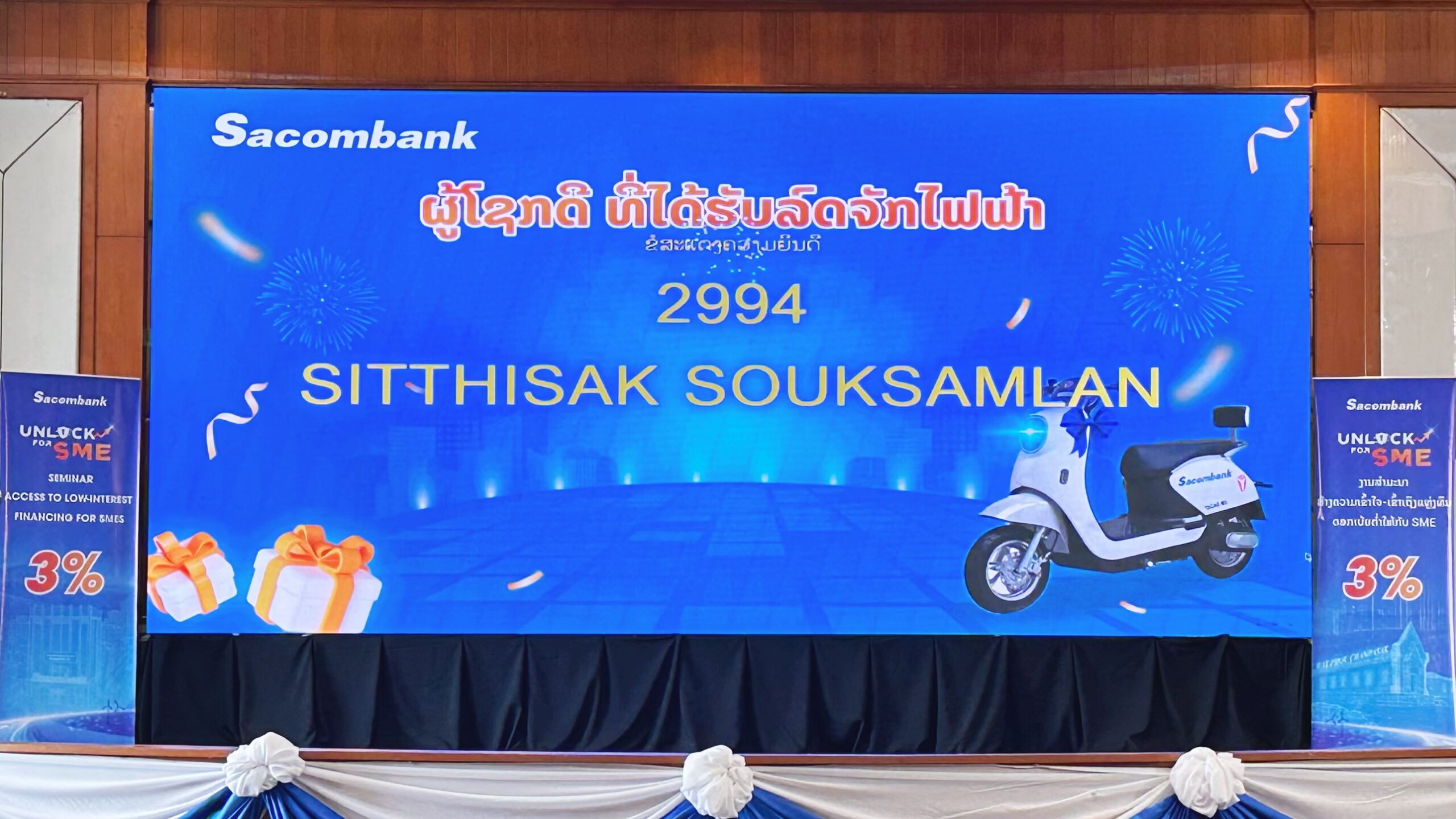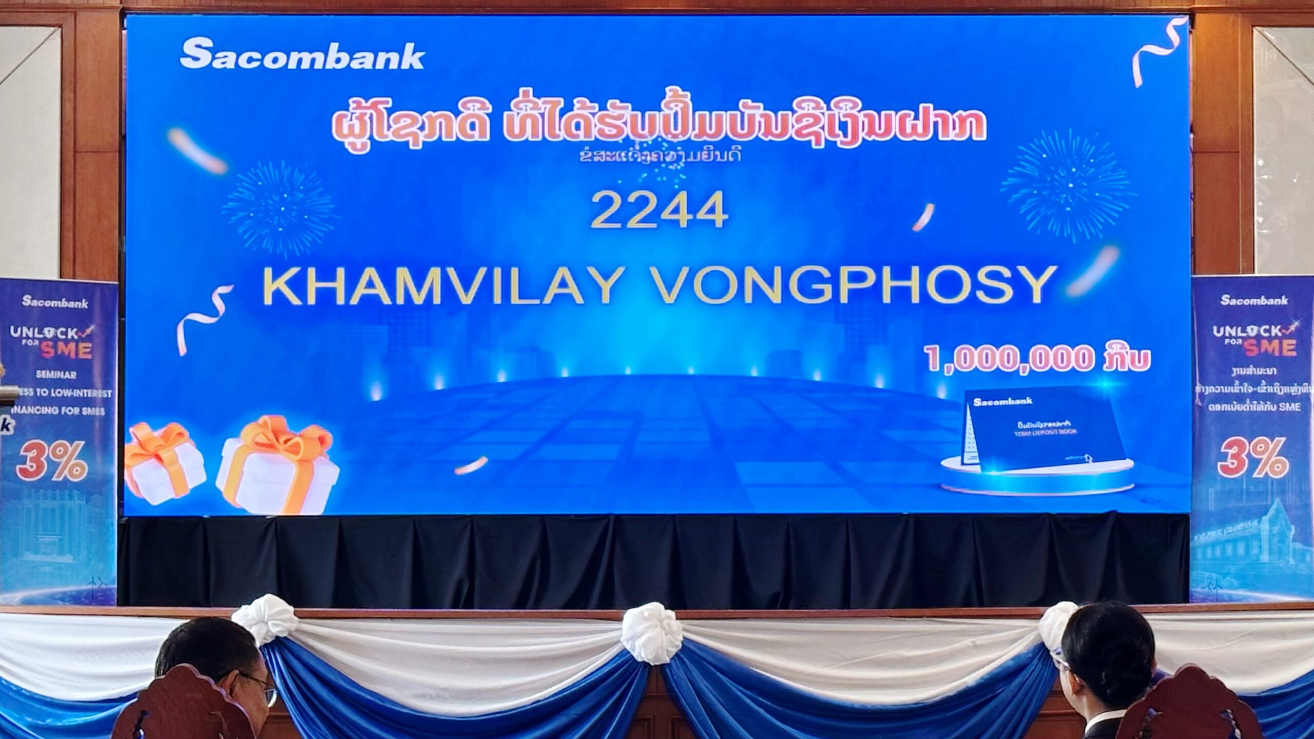 Sacombank Lào vừa tổ chức Lễ quay số trúng thưởng Quý II trong khuôn khổ chương trình “Gửi tiền trúng xe ô tô cùng Sacombank Lào 2025”. Lễ quay thưởng diễn ra trực tiếp tại Hội thảo “Tháo gỡ khó khăn cho doanh nghiệp SME trong tiếp cận nguồn vốn”, với sự tham dự và giám sát của đại diện cơ quan quản lý, cộng đồng doanh nghiệp và đông đảo khách hàng.