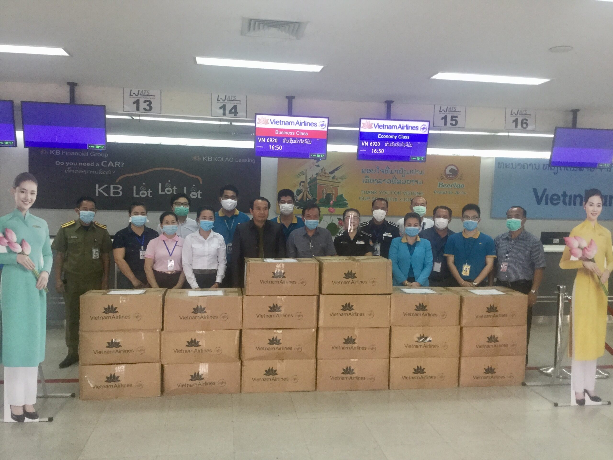Mới đây, lúc 10h00 hôm nay 8/5, Vietnam Airlines thông qua chi nhánh của mình tại Lào đã thực hiện trao tặng vật tư y tế cho các đơn vị hàng không Lào gồm Cục Hàng không dân dụng Lào, Cơ quan quản lý và khai thác sân bay Wattay, Tổng công ty quản lý bay Lào, Công ty Phục vụ mặt đất Lào Nhật (Lao Japan Airport Terminal Services Co., Ltd), Kho hàng sân bay Wattay (Hung Huang Co., Ltd), Công an cửa khẩu – hải quan Lào. Món quà trao tặng là 20.000 chiếc khẩu trang y tế.